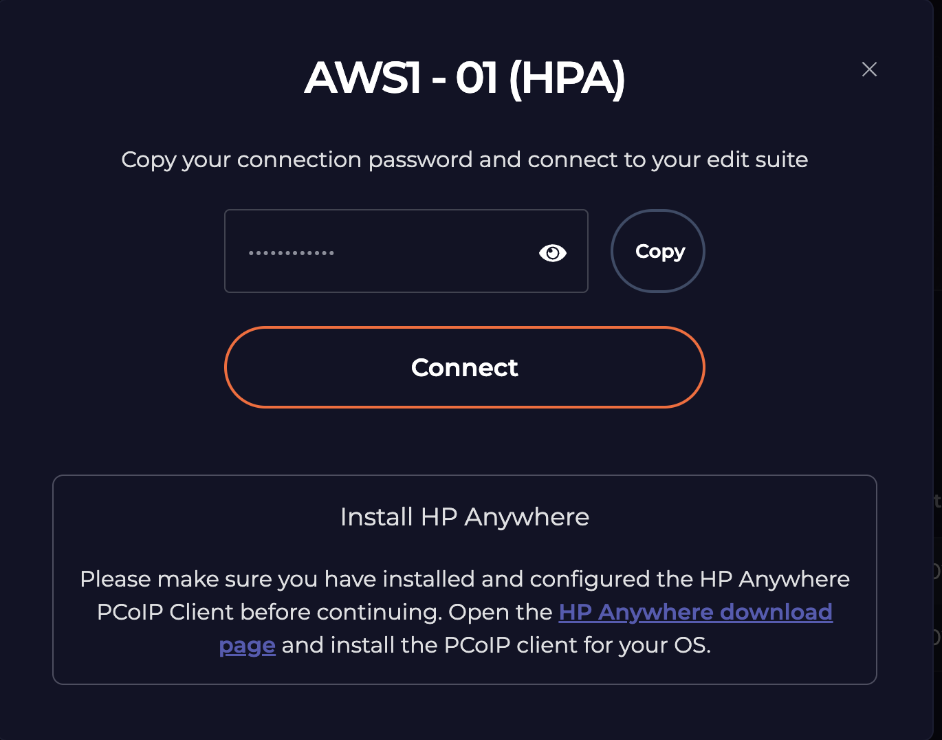 Click on the Copy button to save the password to the clipboard (Pls note this password may change periodically to keep the system secure) and then click on Connect.